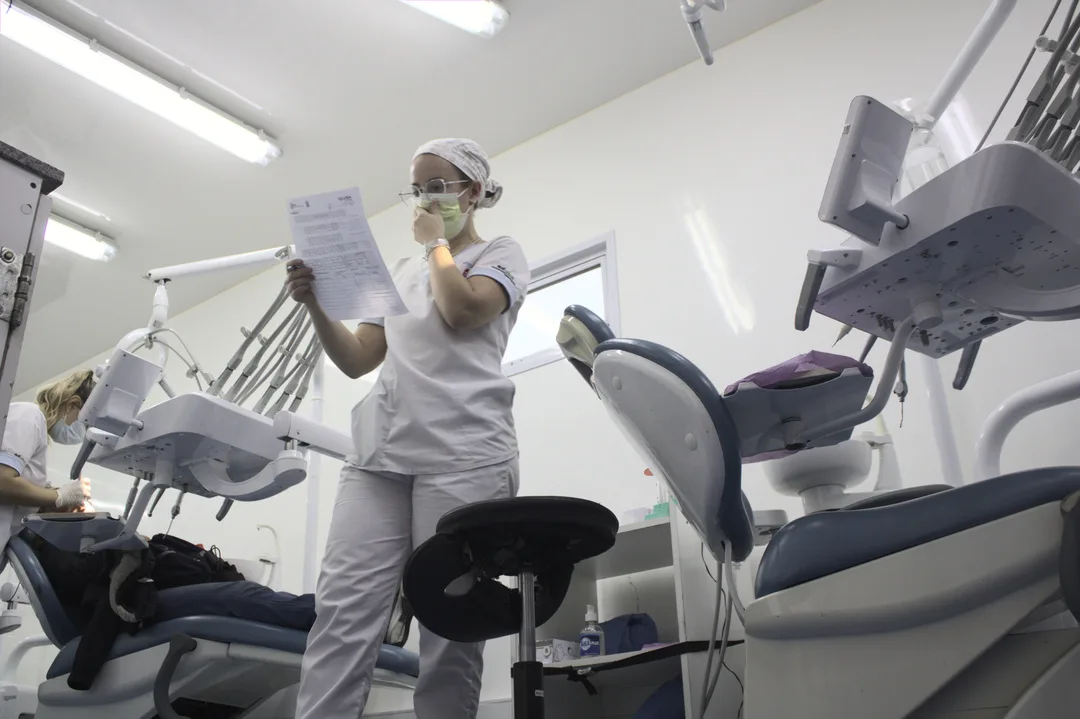 Odontólogo de la Facultad de la UBA realiza una revisión y limpieza dentro de uno de los trailers durante el paro a la japonesa. Foto: Shannon Prickett