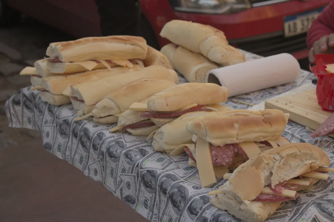 Comenzamos a caminar para ingresar al estadio; somos miles en la caminata. Pasamos por un puesto de sándwiches de salame y queso: 3000 el pequeño, 4000 el más grande. Son los últimos, dice la señora que los vende. Hay muchas remeras violetas en la multitud que camina al estadio, todas iguales. No tengo dudas de que fueron repartidas y se ve que hicieron del mismo talle porque a muchas personas esas remeras les quedan gigantes.