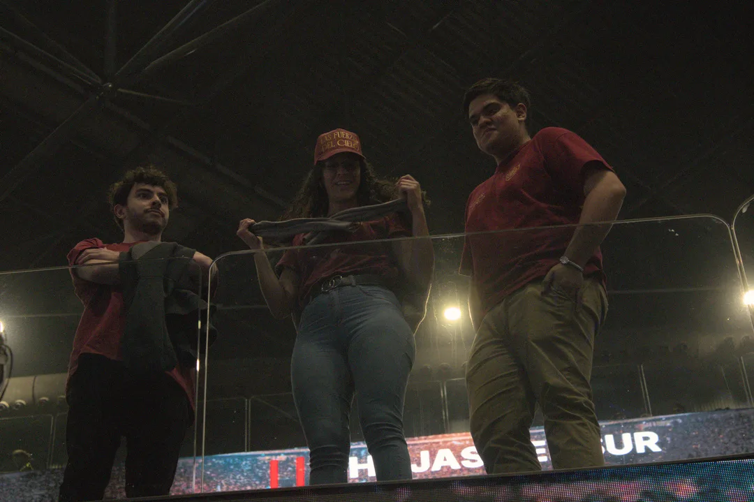 No es convencional: es un performer que domina los silencios tanto como los estallidos, que sabe cuándo bajar la voz y cuándo elevarla hasta convertir el recinto en una caja de resonancia. El magnetismo está en esa autenticidad desatada, en la sensación de que lo que está diciendo lo siente visceralmente. La gente responde: “Milei, querido, el pueblo está contigo”. El público tiene tiempo para cantar algo más: “saquen al pingüino del cajón (…)”.