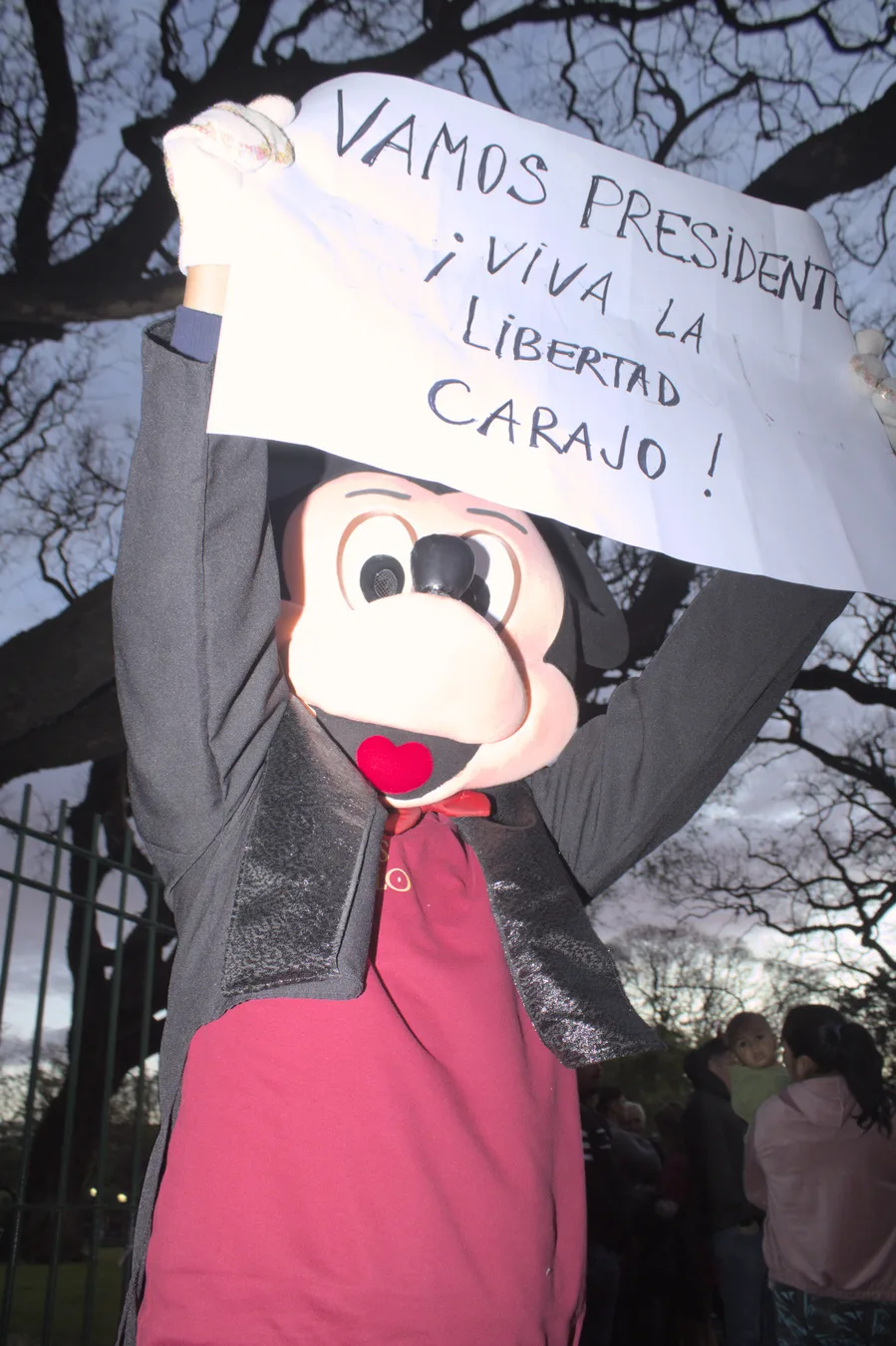 Son las 17 horas y la avenida Corrientes es un caos: hay dos carriles menos a la altura del Parque Los Andes. Unas cuadras antes hay un cordón policial que separa a los manifestantes de La Libertad Avanza y algunos vecinos que se acercaron para protestar. Hay gritos de un lado y del otro, hay gestos que se hacen de un lado y del otro. “Marche una polenta para enfrente”, dice uno burlándose de quienes se acercaron para criticar al presidente. Otra se anima y grita fuerte: “hubieras ganado el ballotage”. Por el otro lado responden con tres dedos levantados y cantan “Milei, basura, vos sos la dictadura”.