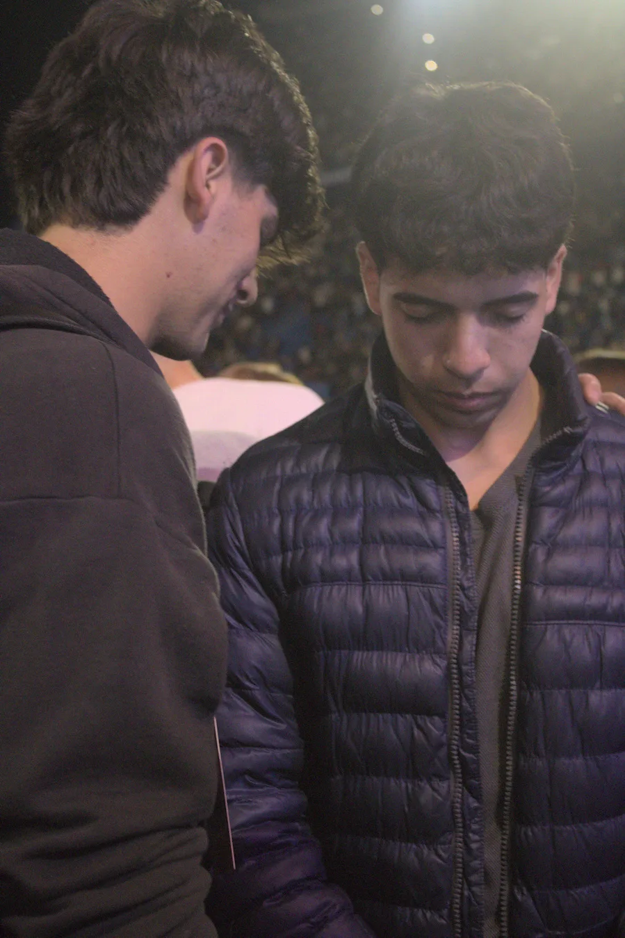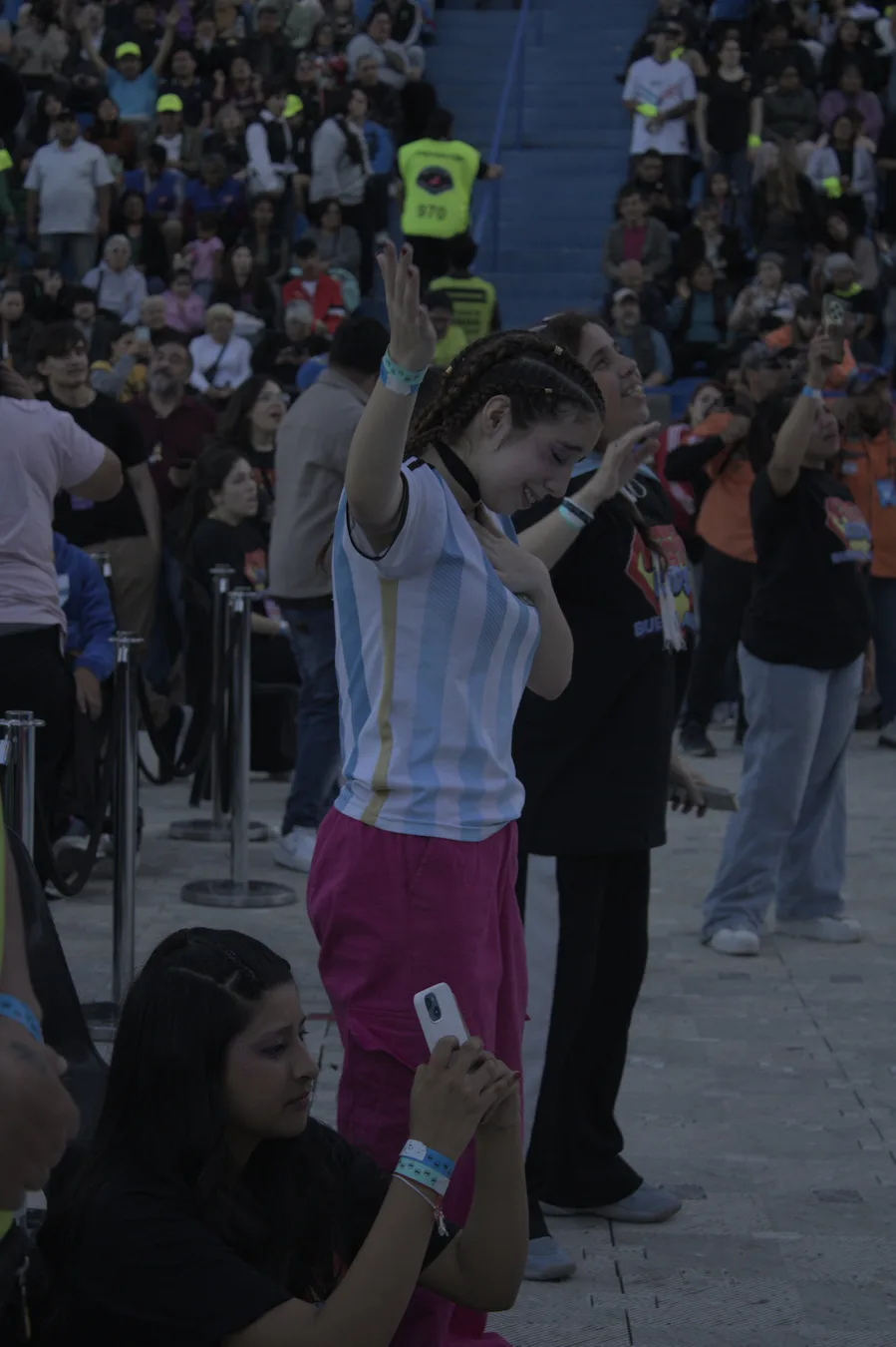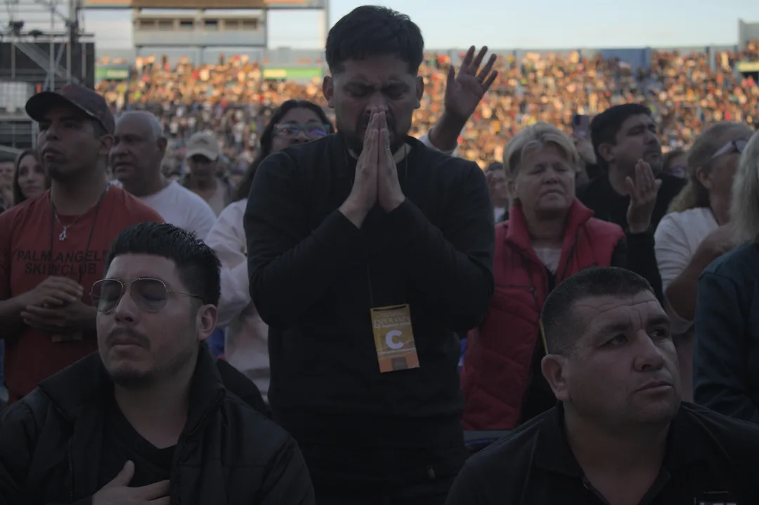Me alejo del escenario. Una de las tantas asistentes que colaboran con la organización del evento responde preguntas de la gente y las orienta hacia los baños y hacia las salidas. De pronto saca el celular, toma una foto, dos. Ya registró ese momento, luego lo guarda. Y levanta las manos hacia el cielo. A su costado, un señor las junta en forma de rezo. Cuando la canción dice: “Mi esperanza está en Dios hasta el final”, la escena se repite en muchos puntos del campo. El estadio está completamente lleno.