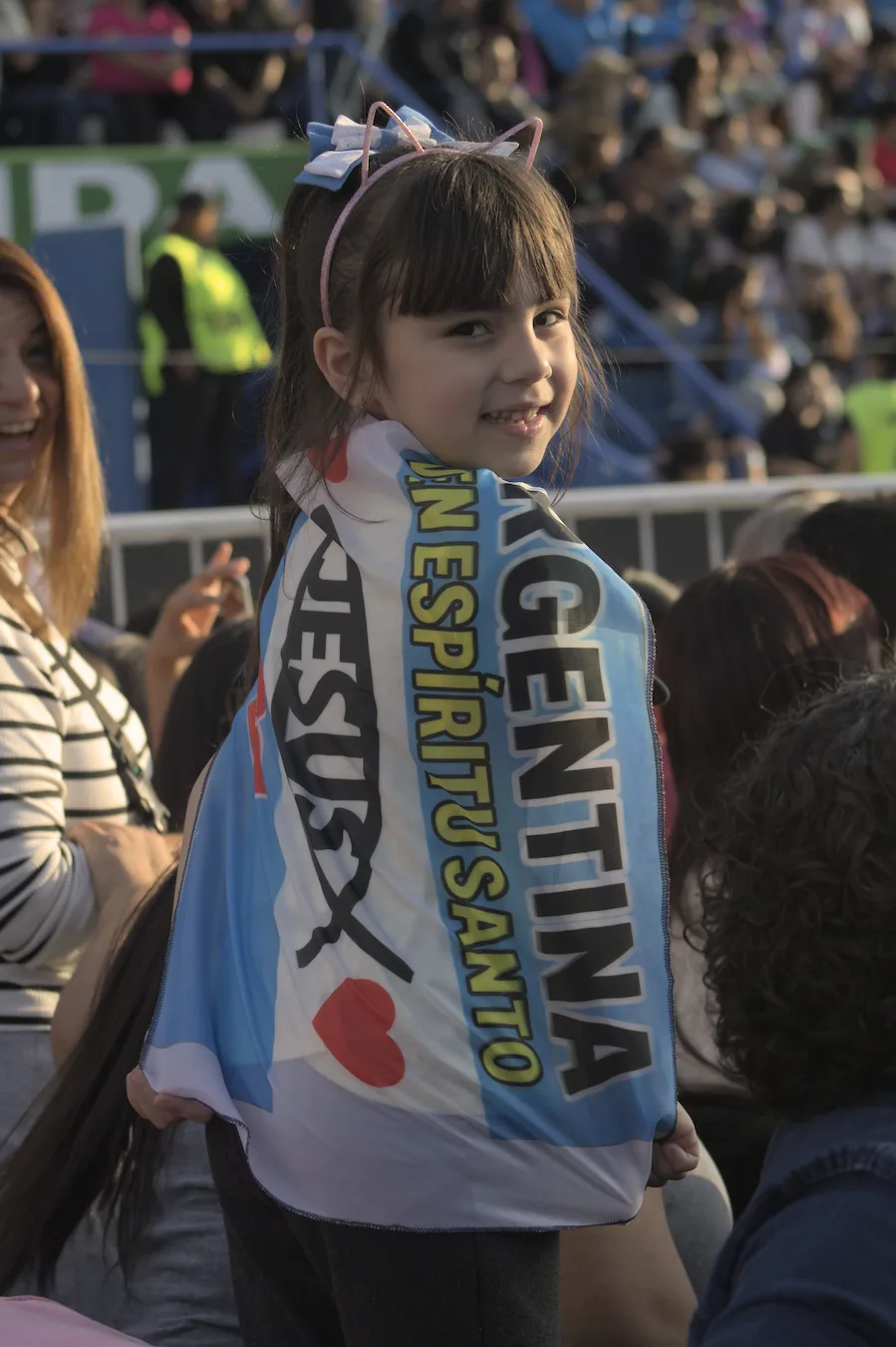 Adentro, en el campo de juego, decenas de niños bailan y cantan en el Festi Kids, un festival realizado para los más chicos. Hay videos, hay bailarines y bailarinas, hay canciones… todo arriba del escenario. Los actores y actrices que participan del show modulan palabras guionadas, pero no las dicen porque sus parlamentos están grabados. Su tonada es más bien neutra. Veo una bandera de República Dominicana, otra argentina con las letras MF en el centro. Un vendedor de Coca-Cola circula entre la gente. Es un estadio de fútbol, después de todo. Pero hoy no hay partido: Franklin Graham ha traído a Buenos Aires su mensaje de esperanza.