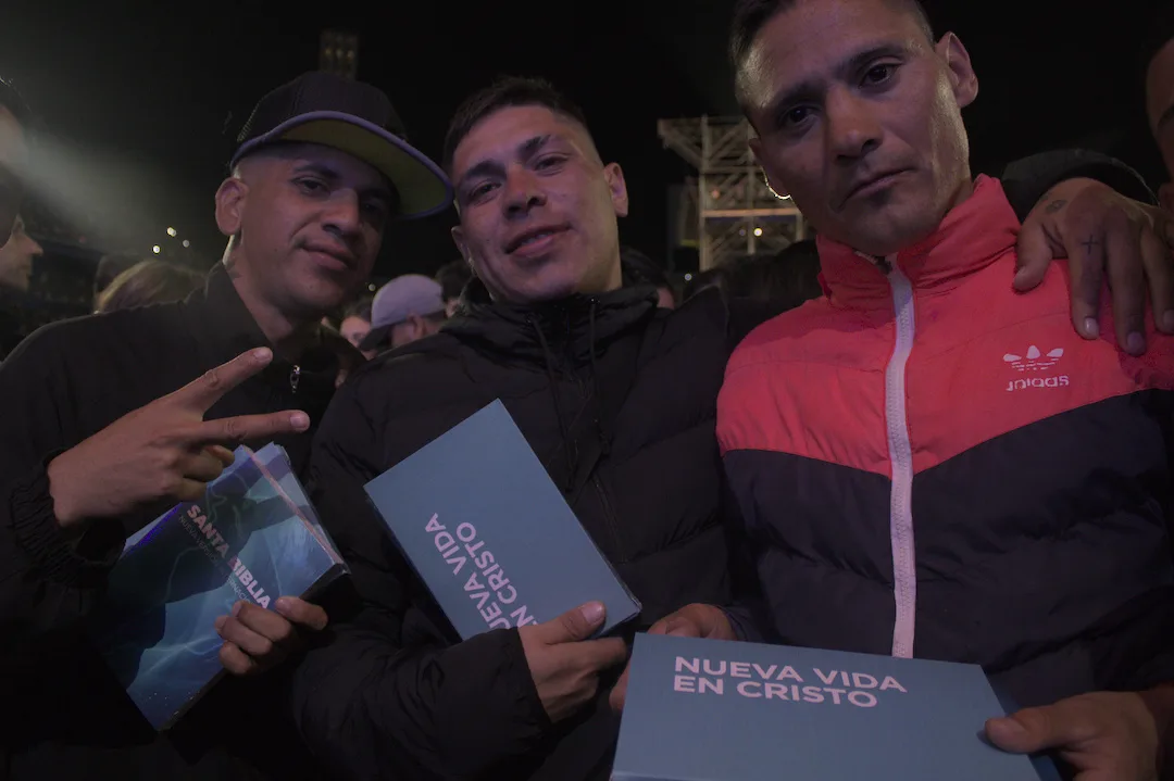 Cuando Graham hace el llamado final —invitando a quienes quieran “tener una relación con Dios” a pasar al frente—, el sábado es “una avalancha de gente”, según Nüesch. Miles pasan adelante. El viernes también hubo respuesta, pero el sábado quedó gente afuera. “Nos quedó chico”, dice Nüesch, aunque con satisfacción: la gente pudo acercarse y escuchar ese mensaje “de manera absolutamente gratuita”. Incluso se repartieron Biblias al finalizar el evento realizado en dos días.